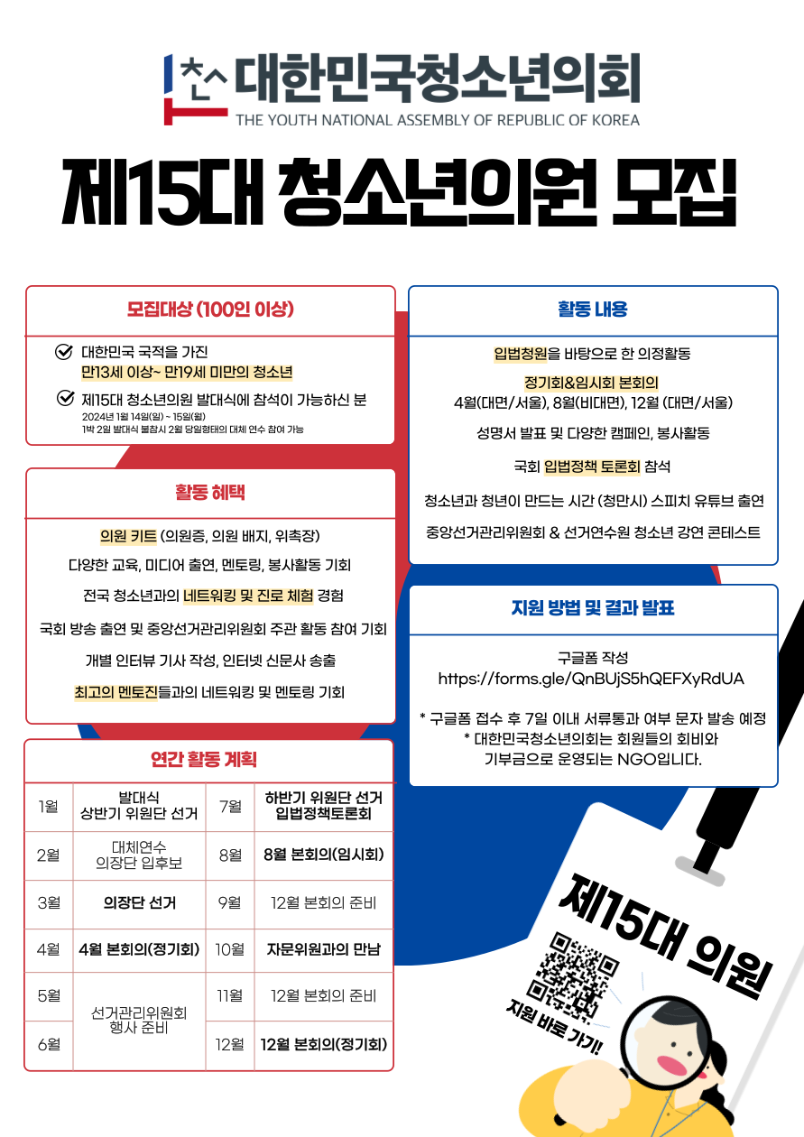 2003년부터 시작된 대한민국청소년의회의 ✨제15대 청소년의원✨을 모집합니다!
