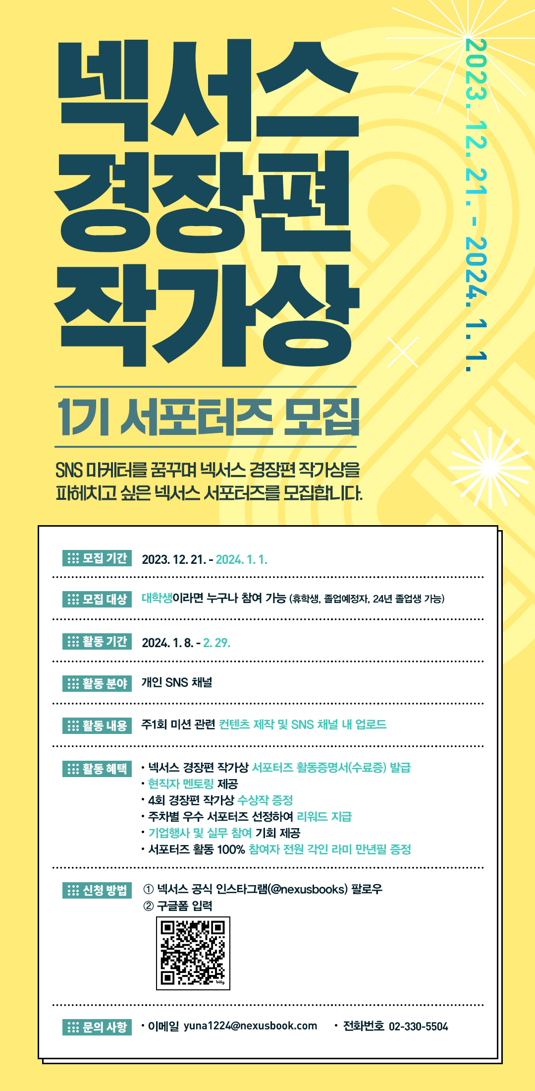 SNS 마케터를 꿈꾸며 넥서스 경장편 작가상을 함께 파해치고 싶은 넥서스 서포터즈를 모집합니다.
