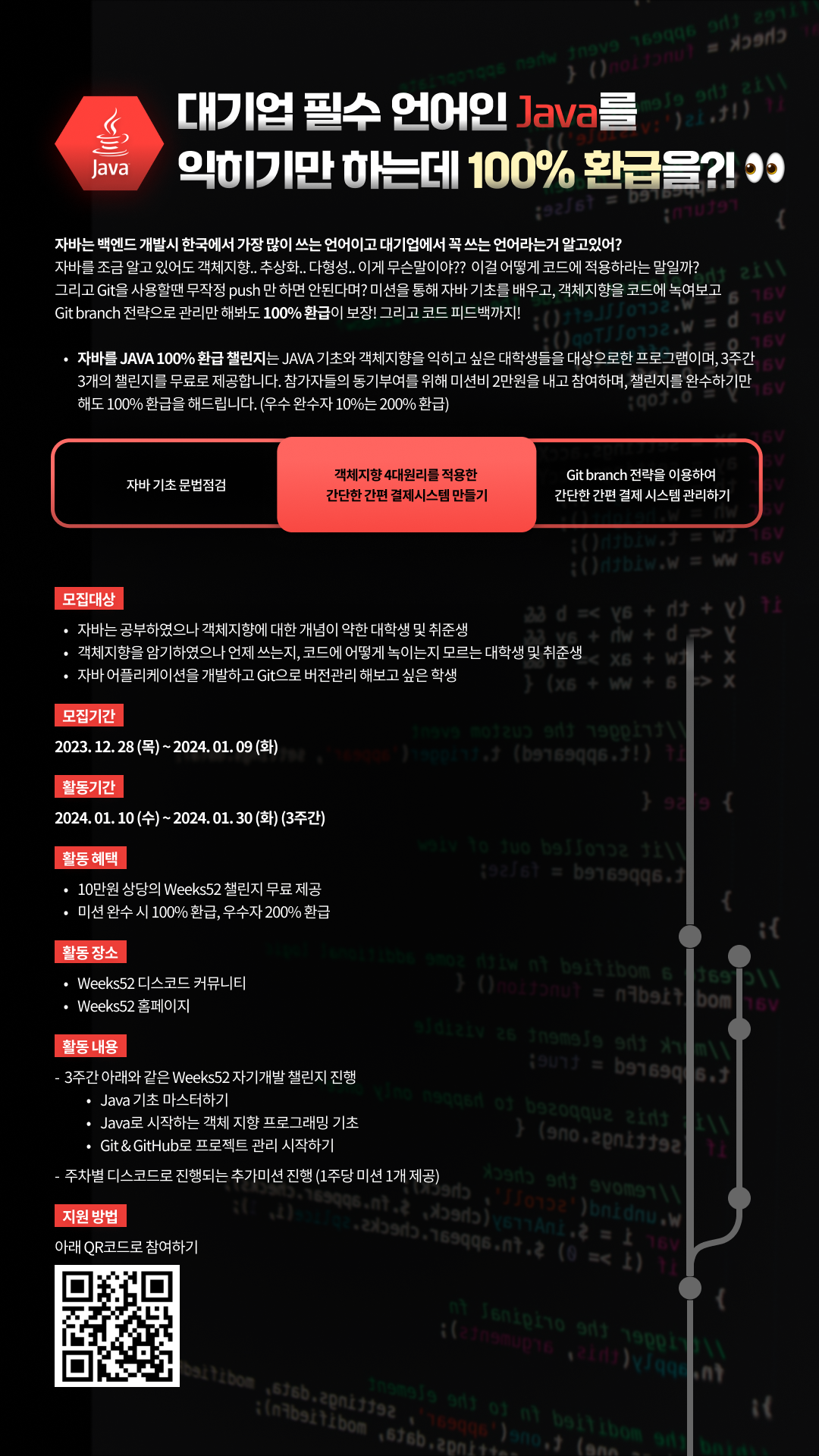 미션을 통해 자바 기초를 배우고, 객체지향을 코드에 녹여보고 Git branch 전략으로 관리만 해봐도 100% 환급이 보장!