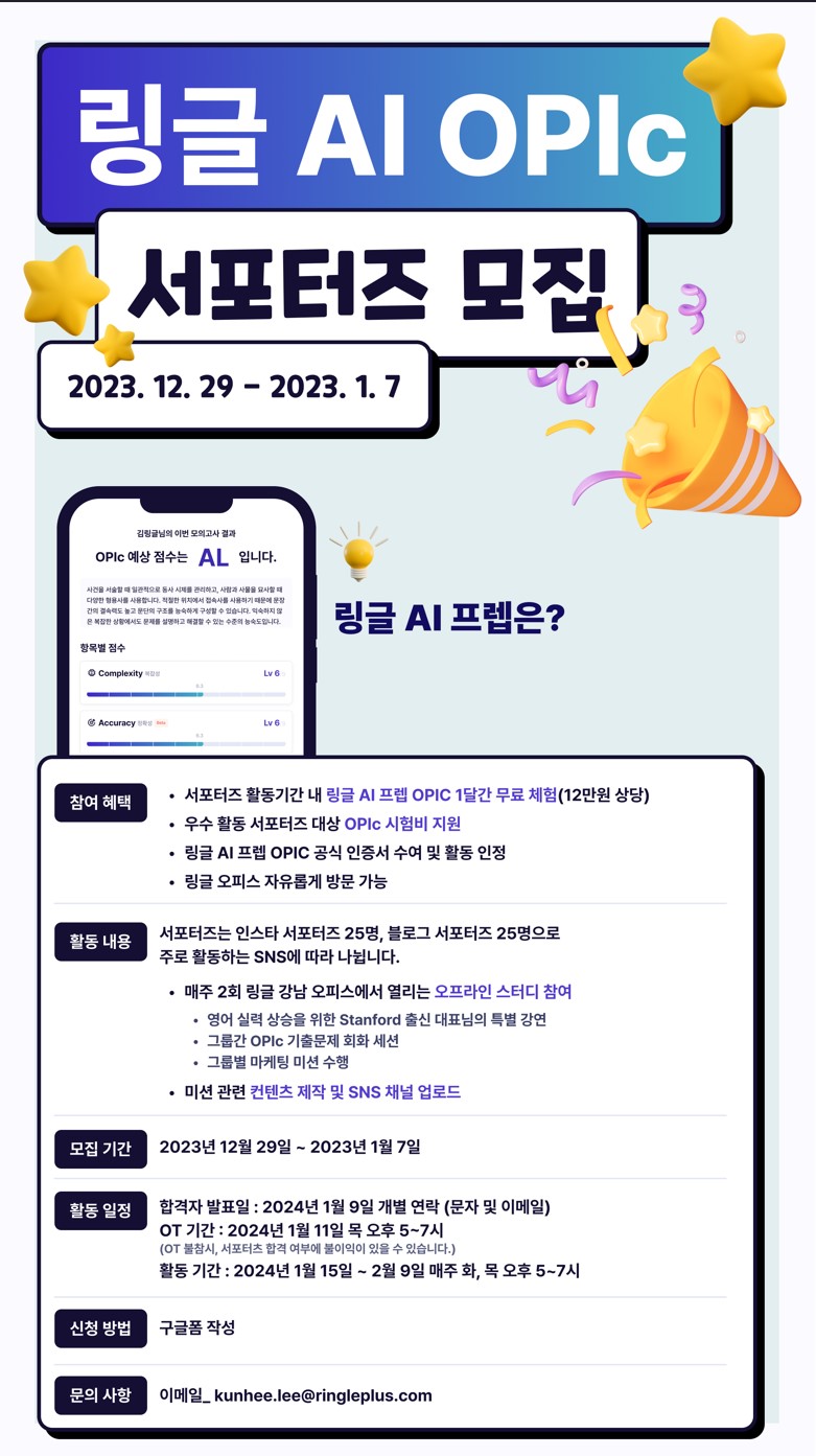링글 AI OPIc 서포터즈는 링글 AI 프렙을 활용해 함께 공부하며 목표 OPIc 점수도 달성하고, 마케팅 경험도 쌓으며 성장하는 서포터즈입니다.