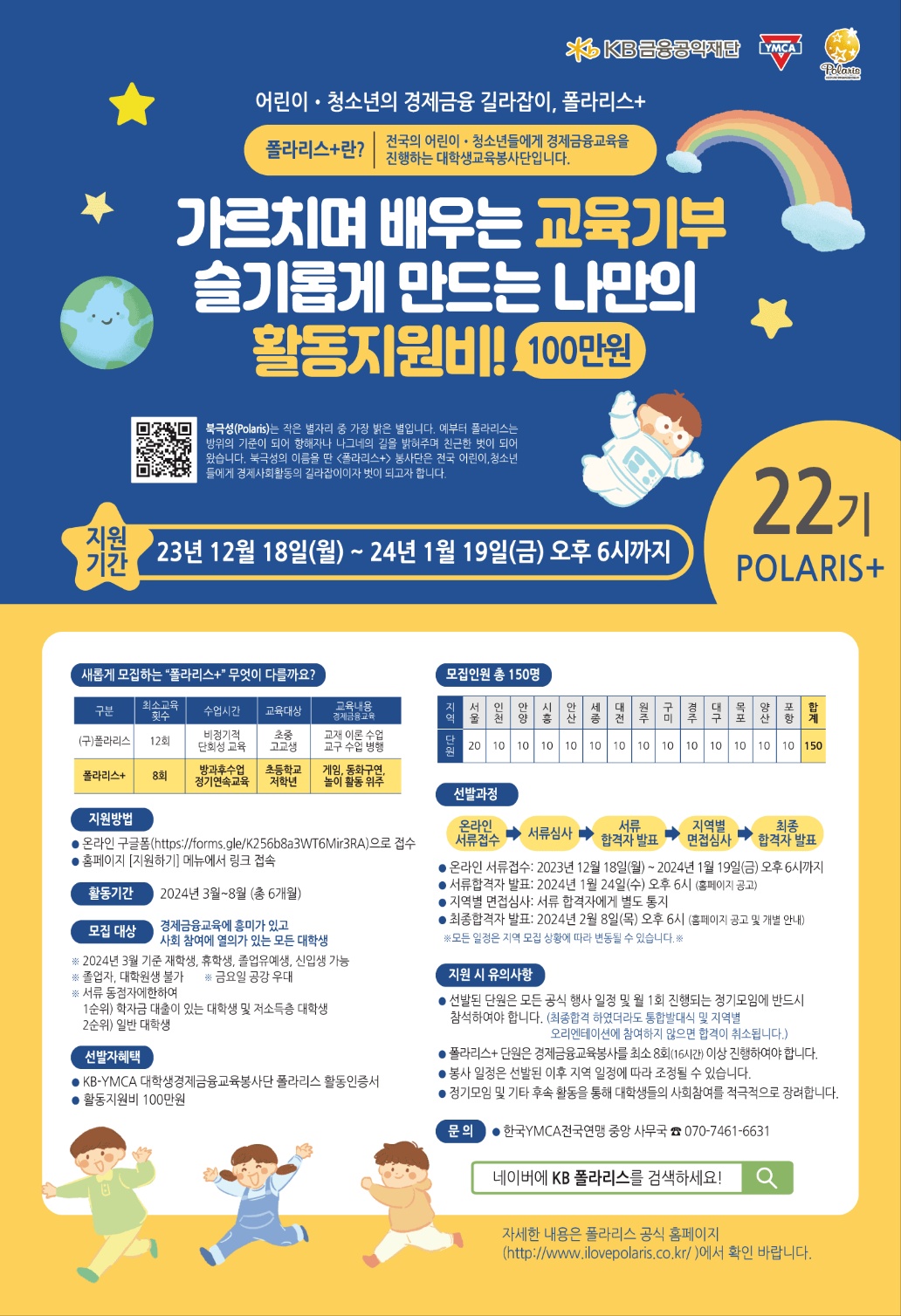 자세한 사항은 홈페이지 [원주]폴라리스+22기 단원 선발 및 운영 일정 안내를 확인해주세요. http://www.ilovepolaris.co.kr/bbs/board.php?bo_table=0401&wr_id=235