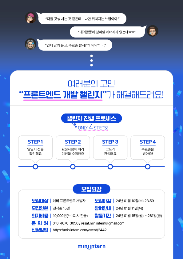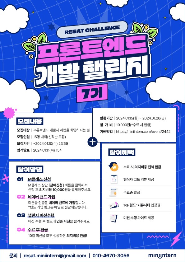 - 참가 비용 : 유료 (의지 비용 10,000원) *수료 시, 의지 비용 환급 예정
