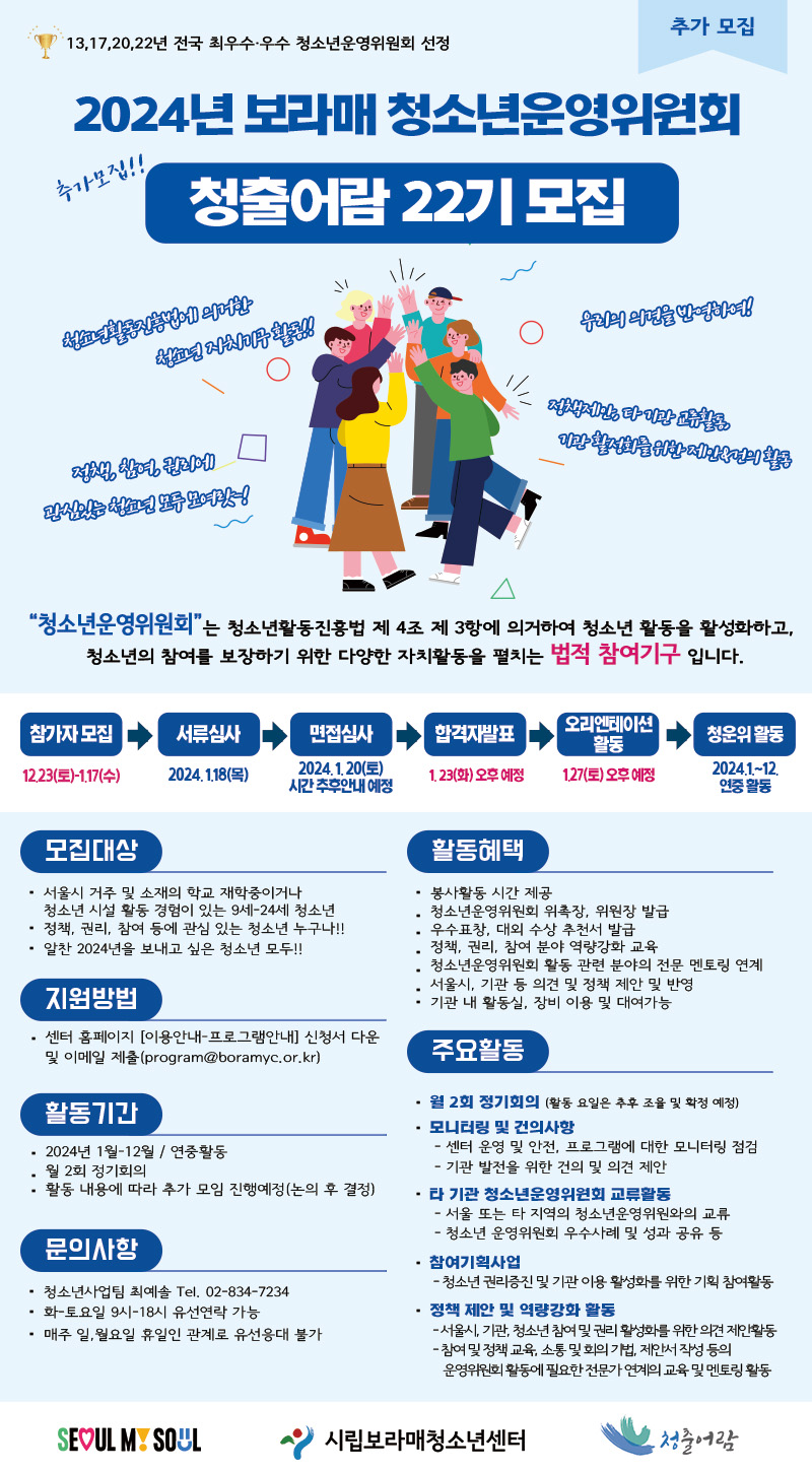 시립보라매청소년센터에서 ‘청출어람 22기’ 활동을 통해 함께 성장 할 청소년위원을 모집합니다!