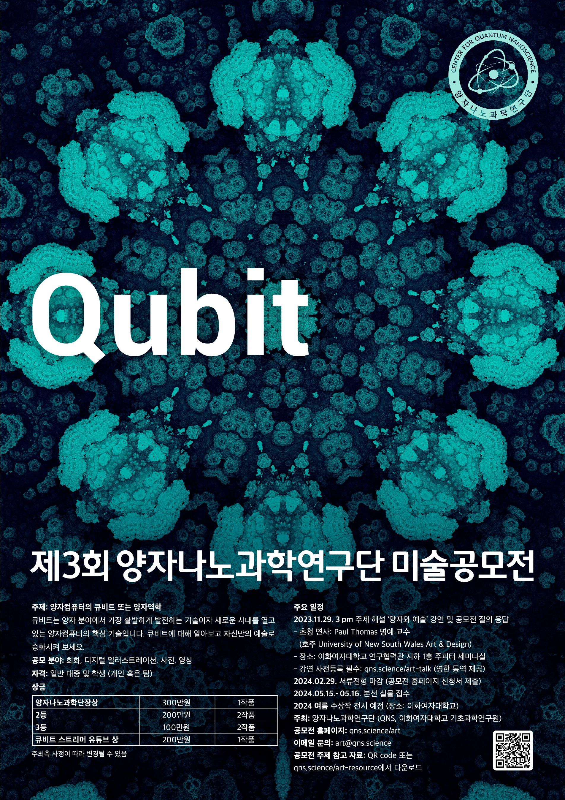 양자나노과학연구단(QNS, 이화여자대학교 기초과학연구원)에서 기초과학의 매력을 미술계와 대중에게 전하고자 “Qubit”라는 주제로 미술공모전을 개최합니다. 본 공모전은 연구단의 주요 연구 주제인 양자컴퓨터의 큐비트(Qubit)와 양자역학(Quantum)을 과학을 어려워하는 일반인에게 창의적으로 소개하기 위해서 기획되었습니다.