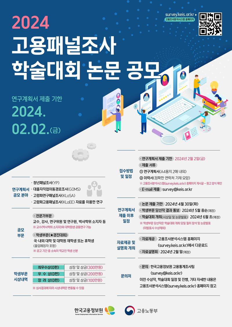 한국고용정보원에서는 전문가부분(교수, 강사, 연구원, 박사학위 소지자 등)과 학생부분(대학생, 대학원생)으로 나누어 ‘2024 고용패널조사 학술대회 논문 대회’ 원고를 모집합니다.