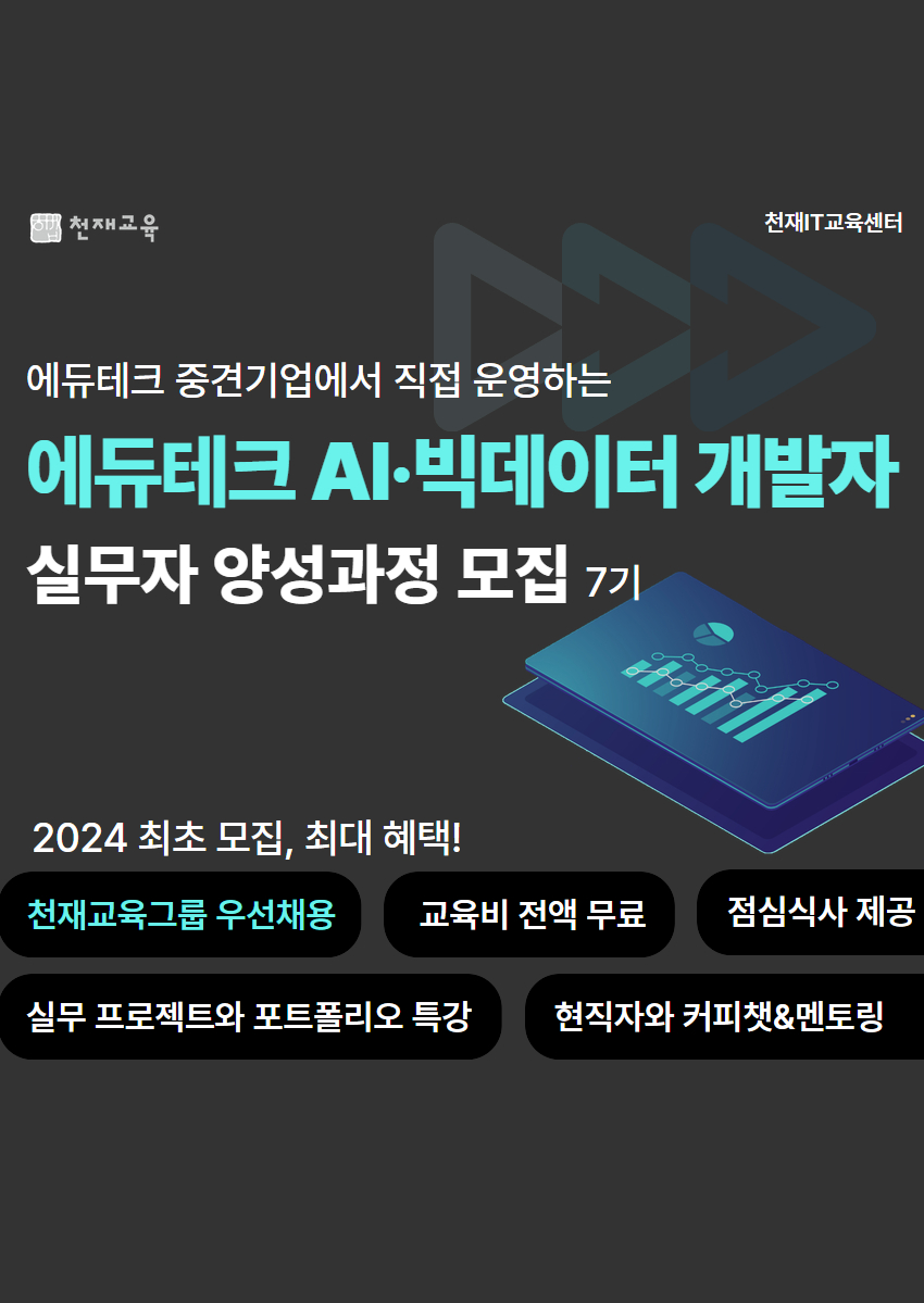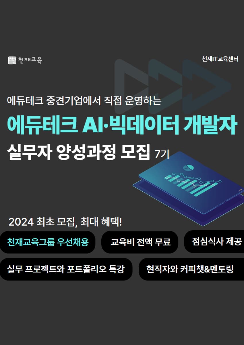 - 교육장소: 1, 7호선 가산디지털단지역 마리오아울렛2관 11층 천재IT교육센터 (오프라인 100%)