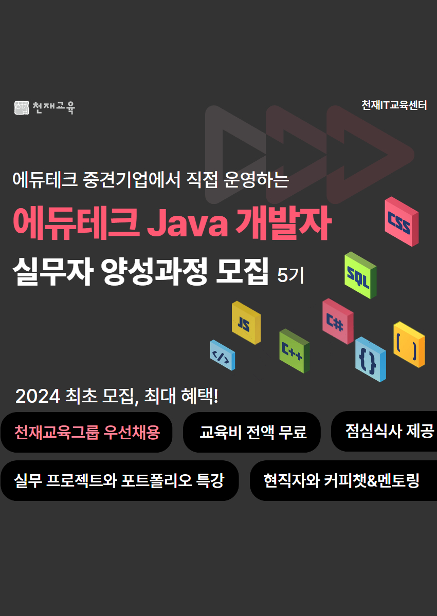 - 교육장소: 1, 7호선 가산디지털단지역 마리오아울렛2관 11층 천재IT교육센터 (오프라인 100%)