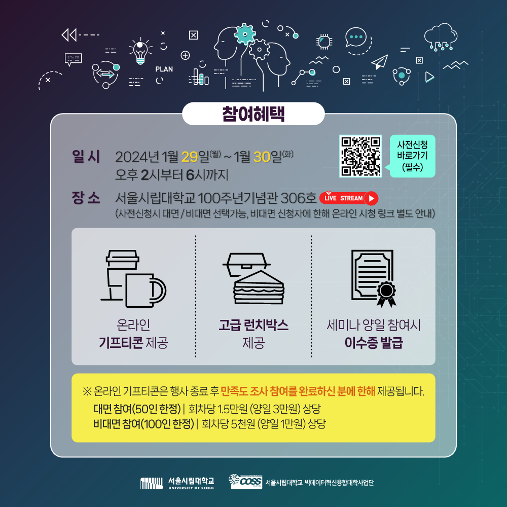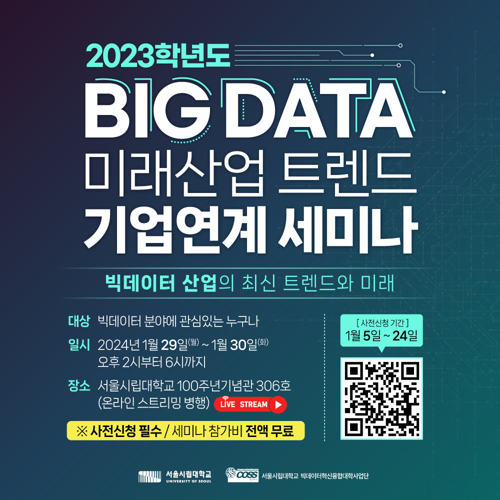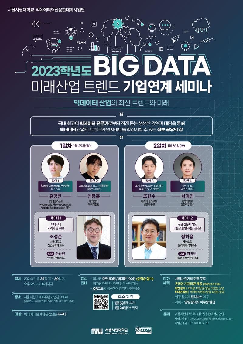 서울시립대학교 빅데이터혁신융합대학사업단이 "빅데이터 산업의 최신 트렌드와 미래"를 주제로 기업 연계 세미나를 양일간 개최합니다.