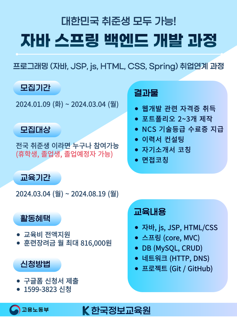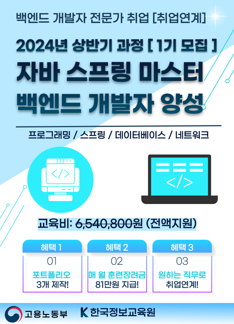 [서울/경기] 자바 스프링 백엔드 개발자 국비지원 무료 취업 교육 (자격증/프로젝트)