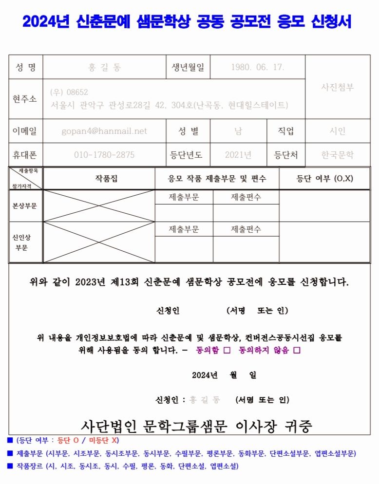 „응모신청서(등단처, 등단년도, 주소, 전화번호 등, 기재) => 이메일 or 카톡 제출