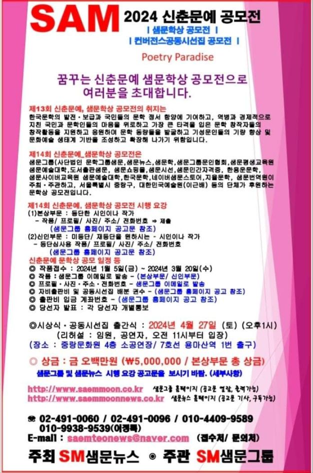 이번 2024년도 상반기에 실시하는 <신춘문예> <샘문학상> 공동공모 및 14번째 <컨버전스