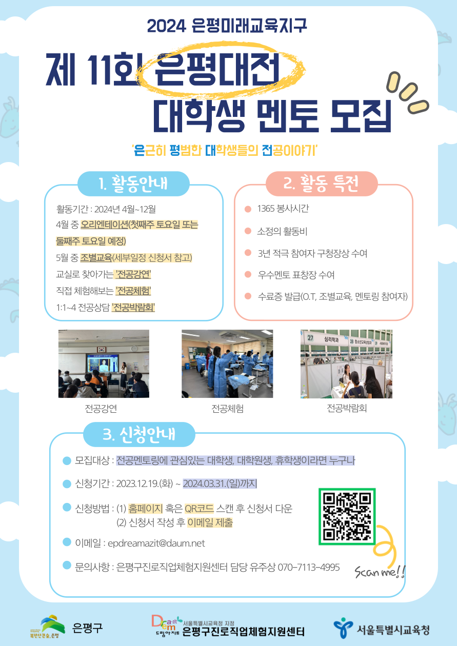 은평구진로직업체험지원센터에서 전공 멘토링에 관심있는 대학생 멘토를 모집하고 있습니다. 저희 은평구진로직업체험지원센터(이하 은평진로센터)는 '서울시교육청'과 '은평구'가 협약하여 '사회복지법인 엔젤스헤이븐'에서 위탁 운영하고 있는 청소년 진로 직업 체험 및 교육지원 공공기관 입니다. 올해 10년을 맞이한 은평대전 사업은 '은근히 평범한 대학생들의 전공이야기'라는 줄임말로 대학생 멘토, 청소년 멘티의 만족도가 매우 높은 은평구 대표 진로·진학지원 사업입니다. 과거 청소년시절때 어떤 학과가 나한테 맞는지 결정하는데 있어 어려움이 있었을거에요. 그때를 회상하며 학과 설정에 어려움을 겪는 청소년들을 위해 여러분들이 전공하고 있는 학과와 진로·진학 스토리를 들려주시면 어떨까요! 또한 대학생 여러분에게는 교육, 스피치, 강연을 위한 학과 지식 향상의 기회를 제공함으로서 여러분들도 성장할 수 있는 기회에 함께 해보시는 건 어딸까요:) 1. 모집요강※모집기간 : 2023.12.19(화) ~ 2024.3.31(일) 선착순 150명 모집 ※활동내용 : - 대학생멘토교육(오리엔테이션, 조별교육) 참가 - 중·고등학교로 찾아가는 '전공강연' - 학과 실무를 체험해보는 '전공체험' - 1대 1~4의 소그룹 전공상담 '전공박람회' ※모집대상 : - 전공멘토링에 관심있는 대학(원)생이라면 누구나 지원가능 - 은평구 중·고등학교 출신, 거주, 대학(원)생 우대 ※신청방법 : (1) 홈페이지(http://www.dreamazit.or.kr/) 접속 및 모집공고를 통해 신청서 다운로드 (2) 신청서에 내용 기입 후 (3) epdreamazit@daum.net으로 제출 2. 문의사항▷ 이메일 : epdreamazit@daum.net ▷ ☏ : 은평대전 담당 유주상 070-7113-4995(상담가능시간 : 평일 09:00 ~ 18:00 ) ▷ 온라인 홈페이지 : Q&A게시판 3. FAQQ1) 대학교, 전공 제한이 있나요?? A1) 아니요! 은평대전은 ‘전공’멘토링 프로그램으로 대학교 제한이 없으며, 다양한 전공멘토님들을 모시기 위해 노력하고 있습니다! Q2) 졸업유예, 휴학생도 가능한가요?? A2) 휴학생 등 대학교 혹은 대학원에 소속된 분이라면 모두 가능합니다! Q3) 은평구에 거주하지 않아도 활동가능한가요?? A3) 네! 은평구로 이동해서 활동이 가능하시다면 활동가능하십니다. Q4) 활동횟수가 궁금합니다!? A4) 은평대전은 4~5월 멘토교육(O.T, 조별교육)을 모두 참여하시고 나면, 이후 6월 ~ 12월까지 이어지는 개별 활동에 가능한 시간을 멘토가 개별적으로 신청해서 활동하는 프로그램입니다! 그래서 공지되는 일정을 확인 후 신청해서 참여해주시면 되겠습니다 :) Q5) 신청 제한이 있나요?? A5) 은평대전은 신청제한 없이 선착순으로 신청을 받고 있으며 모든 멘토님들이 멘토교육만 다 참여하신다면 이어지는 멘토링에 모두 참여가능하십니다! 하지만, 학교로 들어가 하는 활동으로 필요한 서류들이 많으니~ 꼼꼼히 작성해주시면 감사하겠습니다! |
