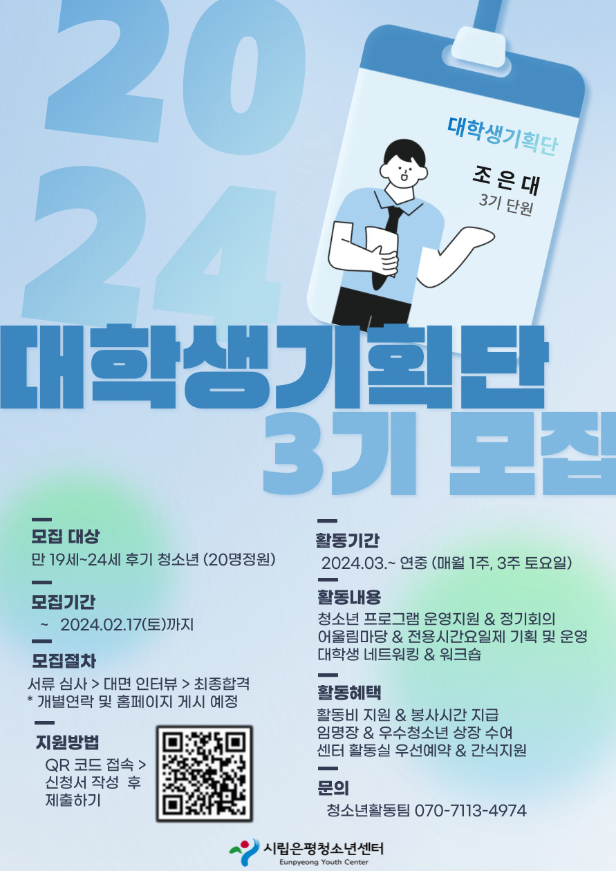 시립은평청소년센터의 청소년 프로그램 기획 및 운영에 주축이 되어 의미있고 보람찬 2024년을 함께할 대학생기획단을 모집합니다!