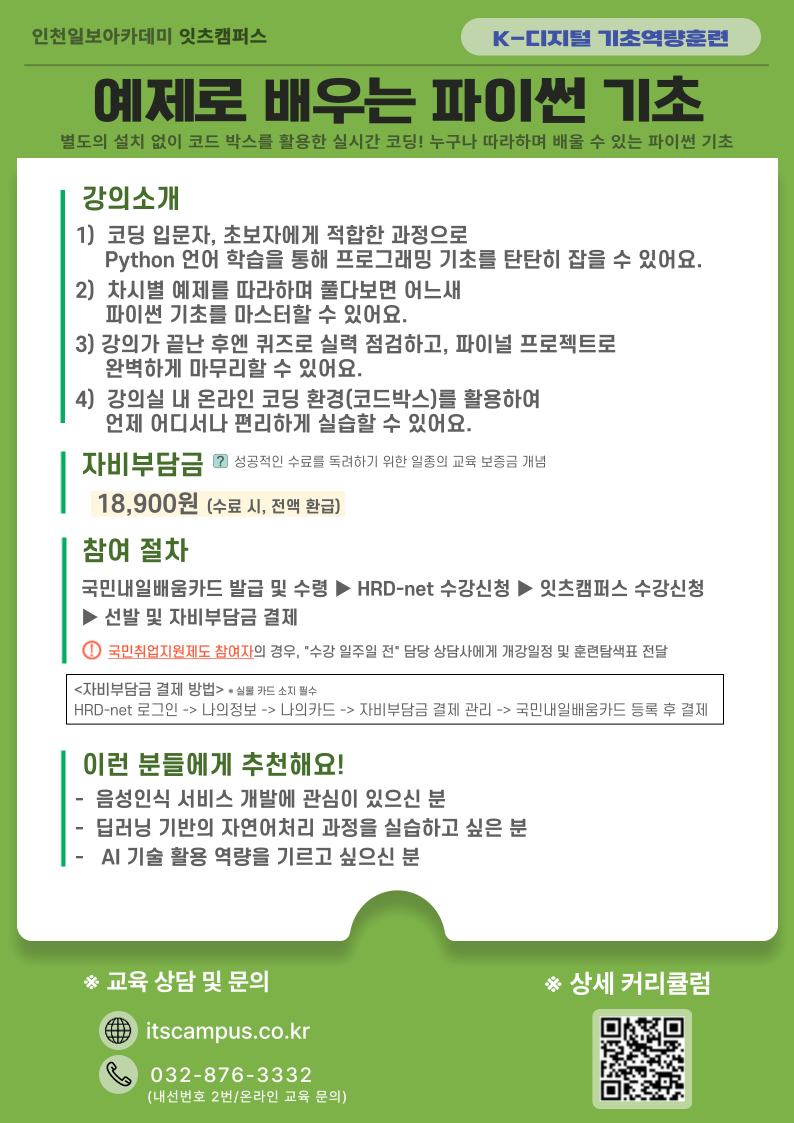 입문자에게 적합한 파이썬 기초 프로그래밍 과정으로 각 차시마다 제시되는 예제와 퀴즈를 통해 변수, 연산자, 제어문 등의 주요 문법을 학습하고, 관련 실습과제와 프로젝트를 수행함으로써 빅데이터 분야에서 많이 활용되는 언어인 파이썬 활용 능력을 습득할 수 있는 훈련과정입니다.