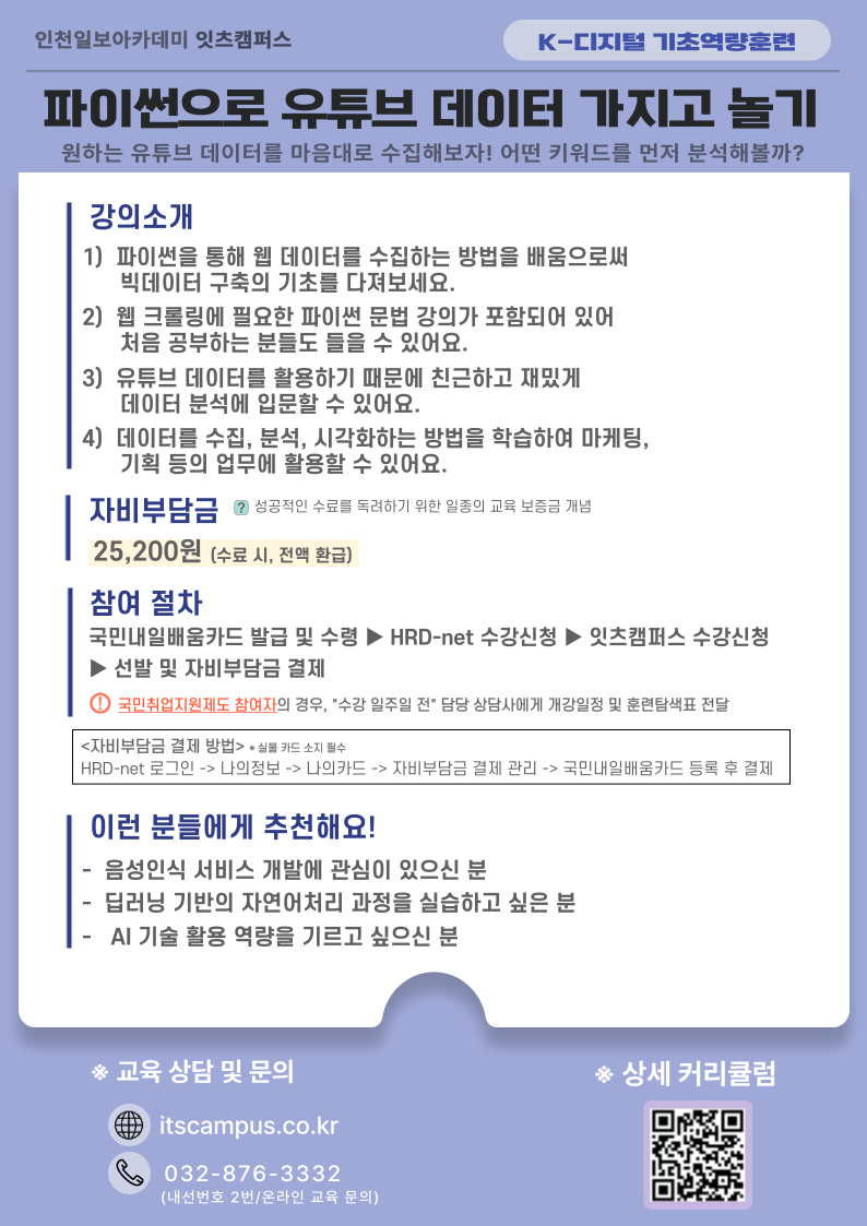 해당과정은 기초지식이 없는 학습자들이 파이썬 주요 문법과 파이썬 기반의 웹 크롤링 기술을 학습하고, 유튜브 데이터를 활용하여 친숙하고 재밌게 크롤링 프로젝트 등을 수행하면서 데이터 분석 역량을 기르고 빅데이터 분야로 입문할 수 있도록 돕는 훈련과정입니다.