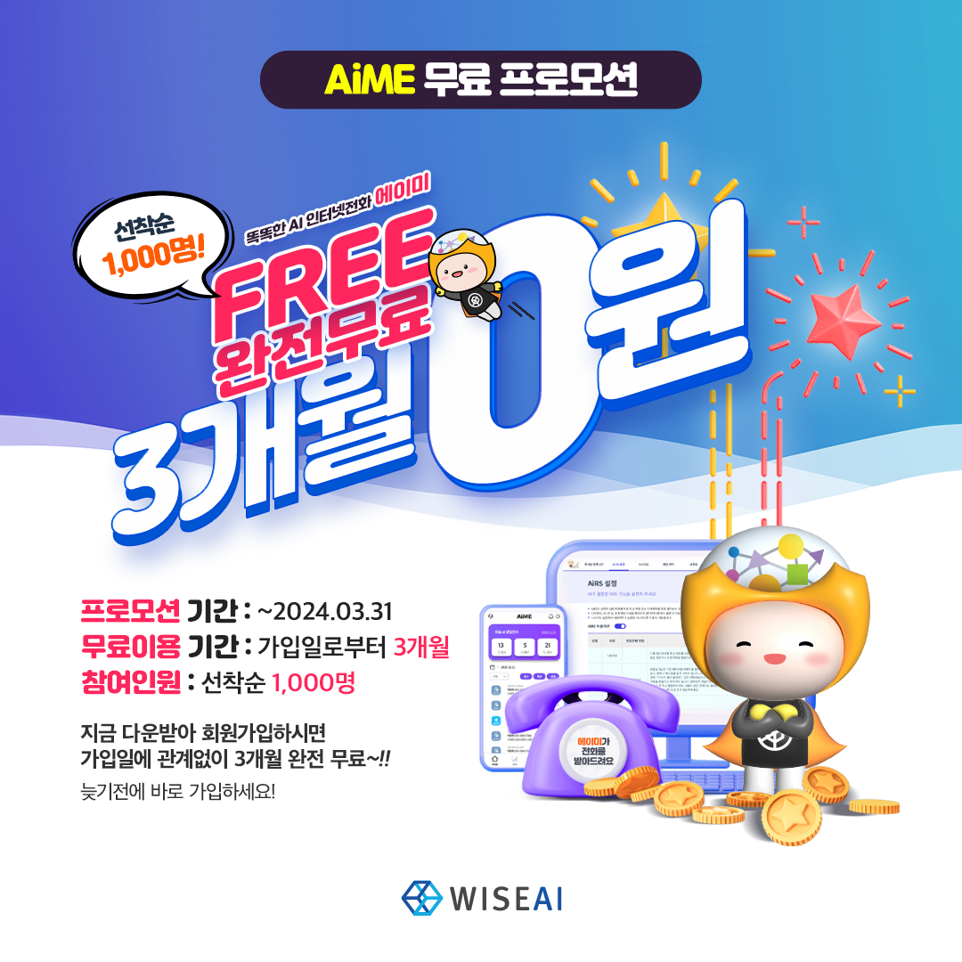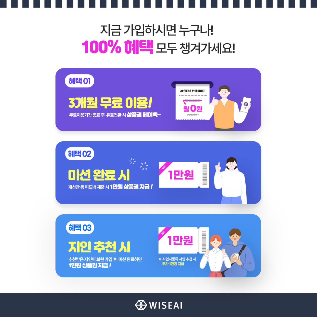 - 본 프로모션은 와이즈에이아이의 사정에 의해 변경 중단될 수 있으며, 관련 내용은 사전 고지될 예정입니다.
