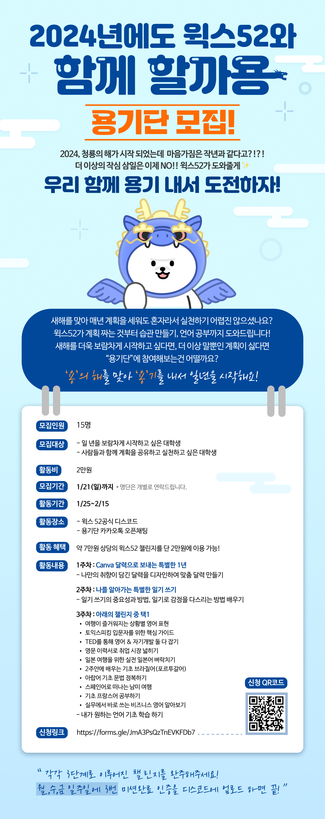 새해를 맞아 매년 계획을 세워도 혼자라서 실천하기 어렵진 않으셨나요? 윅스52가 계획짜는 것부터 습관 만들기, 언어 공부까지 도와드립니다! 새해를 더욱 보람차게 시작하고 싶다면, 더이상 말뿐인 계획이 싫다면 용기단에 참여해보는건 어떨까요?
