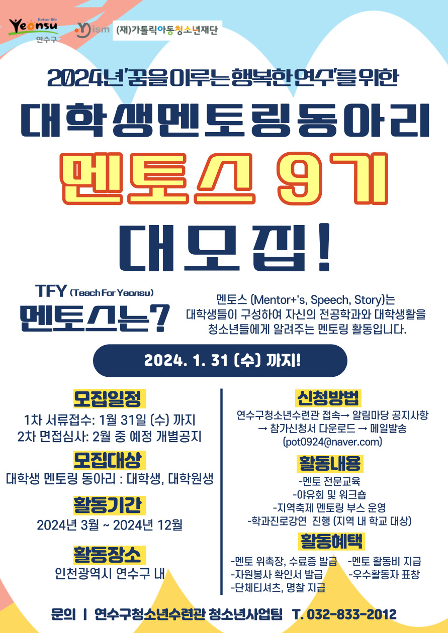 🌼🌻연수구청소년수련관에서는 2024년 대학생멘토링동아리 "멘토스 9기"를 모집합니다!🌻🌼
