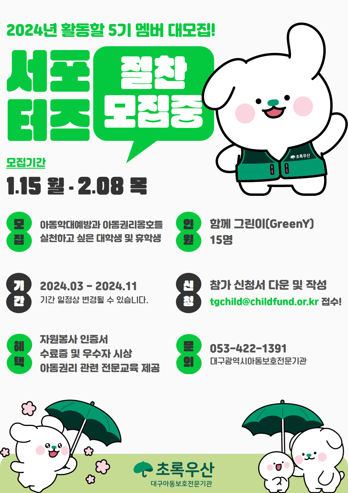 대구아동보호전문기관에서 온라인 콘텐츠 기획 및 제작을 통해 아동학대예방에 기여하고 아동권리를 옹호할 서포터즈 함께 GreenY(그린이)를 모집합니다.