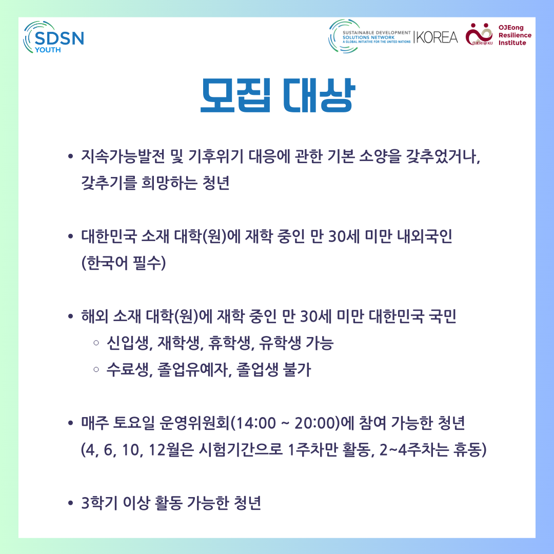 - 지속가능발전 및 기후위기 대응에 관한 기본 소양을 갖추었거나, 갖추기를 희망하는 청년