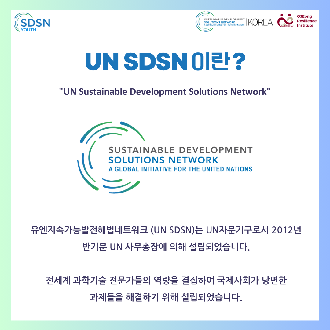SDSN은 전 세계 과학기술 전문가들을 동원하여 SDGs(Sustainable Development Goals)를 수립하고, SDGs와 파리기후협정의 이행과 실용적인 해법을 촉진하기 위해 2012년 반기문 UN사무총장이 창립한 UN자문기관입니다. 저명한 개발경제학자이자 UN사무총장 특별자문관인 Jeffrey Sachs 교수가 대표직을 맡고 있으며, 미국 뉴욕-프랑스 파리-말레이시아 쿠알라룸푸르에 사무국을 두고 145+개 국가에서 50+개 네트워크와 함께하고 있습니다. SDSN은 세계가 직면하고 있는 경제-사회-환경-평화 등에 통합적으로 접근하는 것을 장려하며, UN산하기구-다자간금융기관-민간기업-시민사회와 긴밀하게 협력합니다.