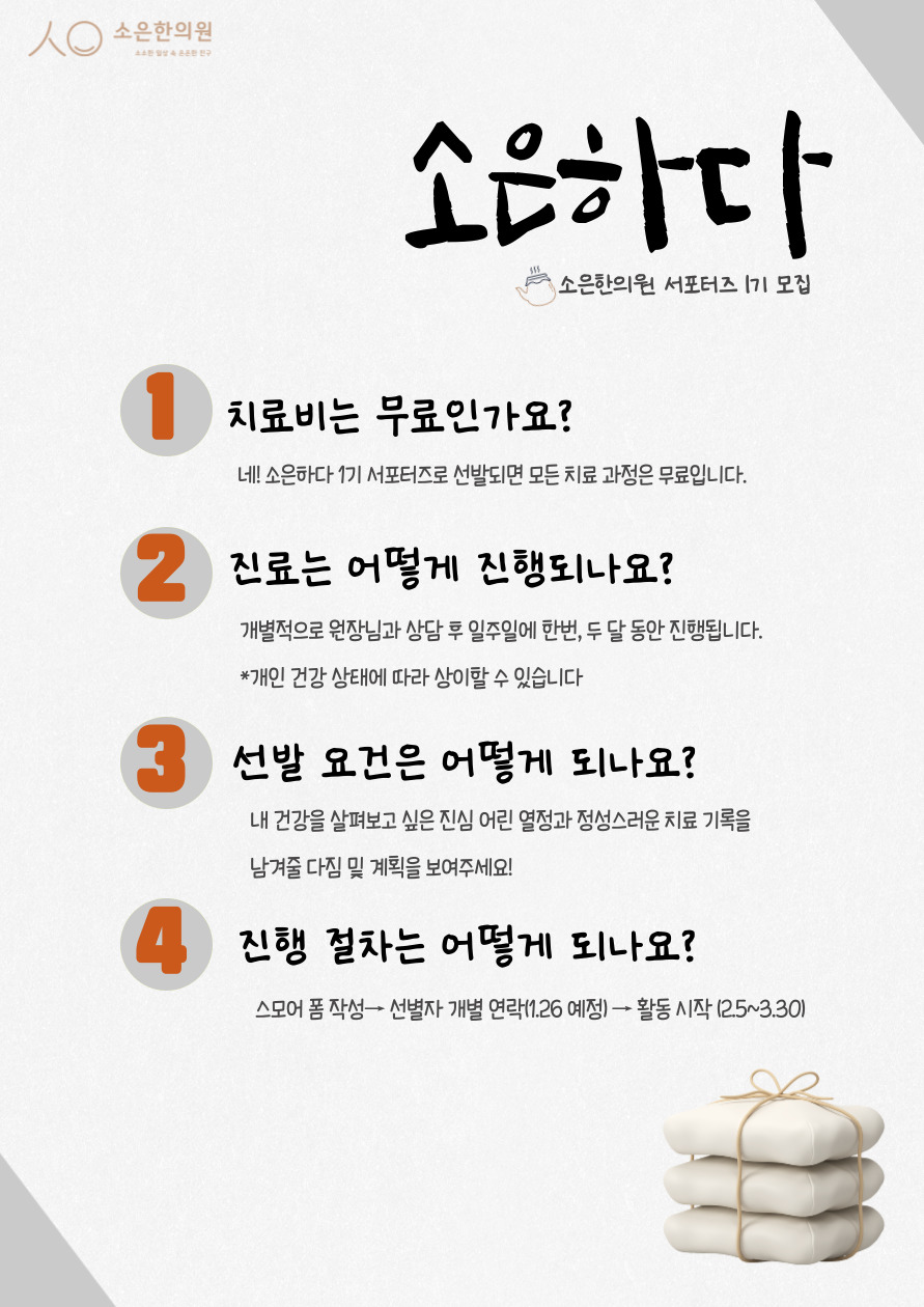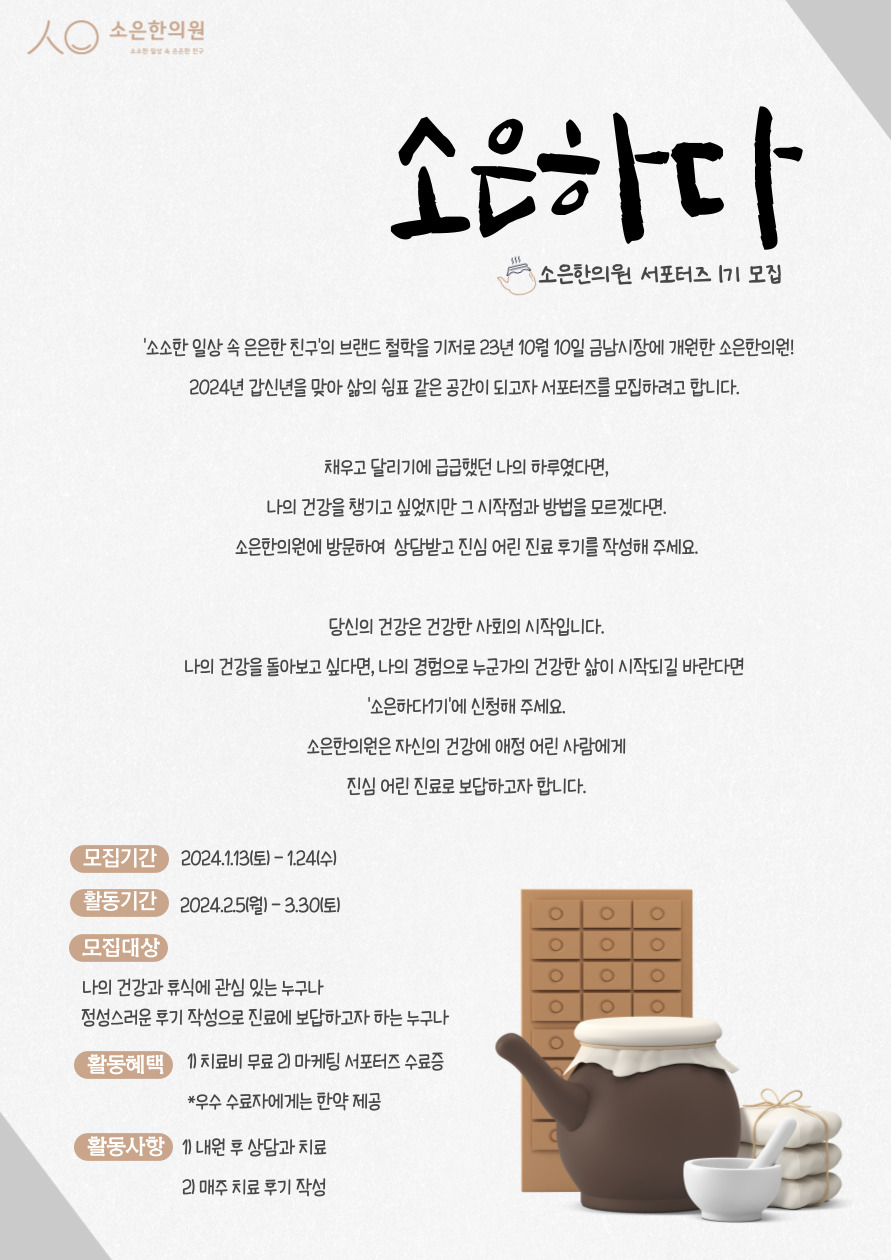 유의사항 : 서포터즈 활동 시 공유된 내용들은 소은한의원 브랜딩에 사용될 수 있습니다