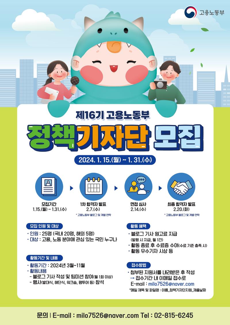 [접수방법] 첨부된 지원서 내려받은 후 작성 →접수 기간 내 이메일 접수(milo7526@naver.com) *메일 제목 및 파일명 : 이름_정책기자단지원_제출날짜 |