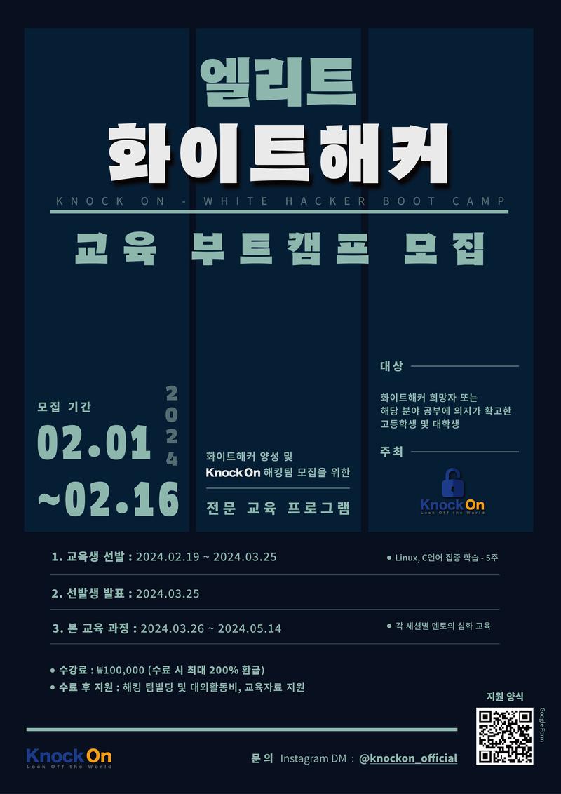 - ๊ต์ก์ ์ ๋ฐ๊ณผ์ ์ดํ ์ ๋ฐ๋ ๊ต์ก์์ ๋์์ผ๋ก ๋ณธ ๊ต์ก๊ณผ์ ์ ์งํํฉ๋๋ค. ๊ต์ก์ ์ ๋ฐ๊ณผ์ ์์๋ ํดํน์ ํ์ํ ๊ธฐ์ด ์ง์์ธ Linux, C์ ๊ฐ๋ฐ์ ๋ํ ์ง์์ ์ค์ ์ ์ผ๋ก ๋ฐฐ์ฐ๊ณ ๋ณธ ๊ต์ก๊ณผ์ ์์ ๋ณธ๊ฒฉ์ ์ผ๋ก ํดํน์ ๋ํด์ ๋ฐฐ์ฐ๊ฒ ๋ฉ๋๋ค.