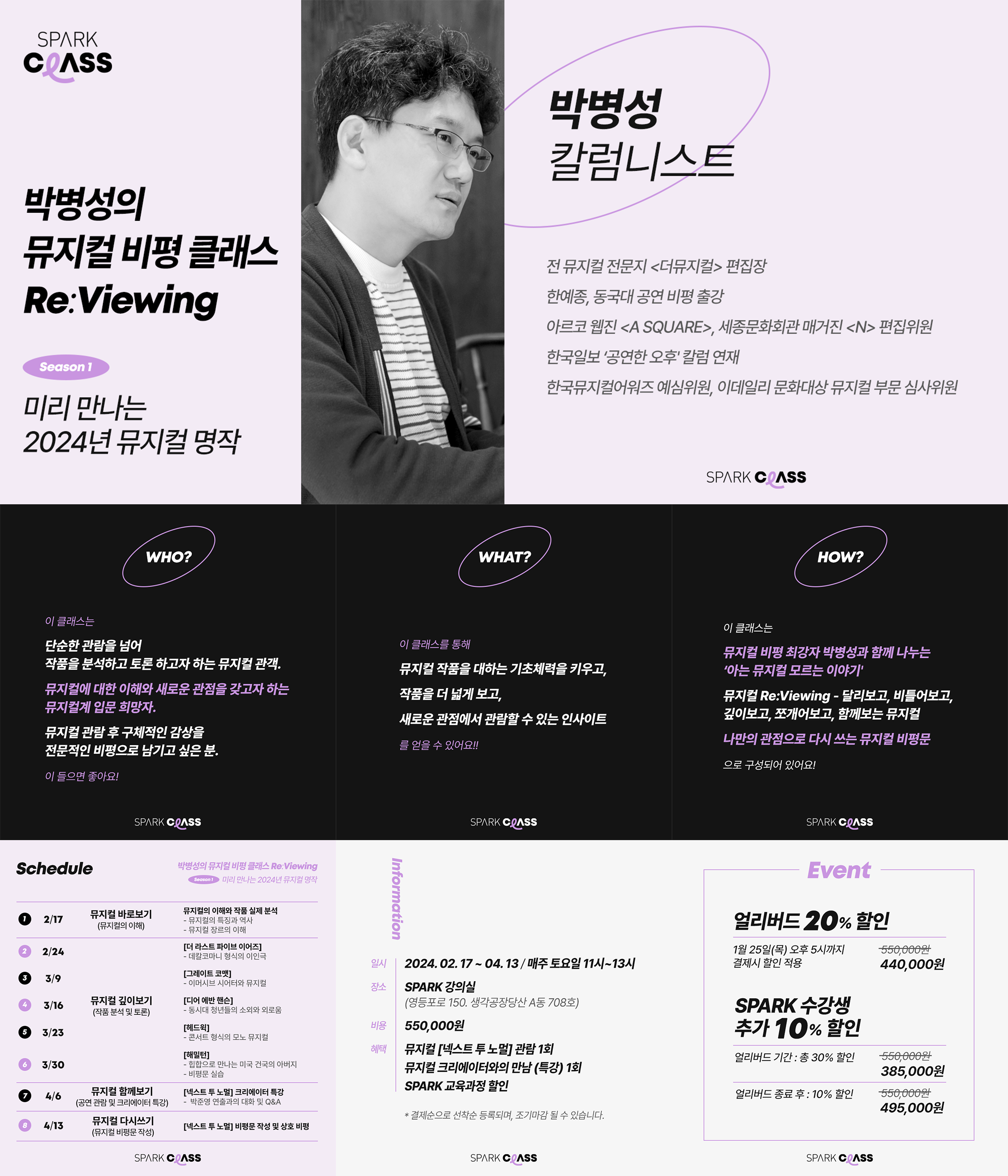 스파크가 뮤지컬 공연에 진심인 분들을 위해 기획한 #박병성의_뮤지컬비평클래스_ReViewing 에서 2024년 올라갈 뮤지컬 명작을 미리 만나보실 수 있습니다!