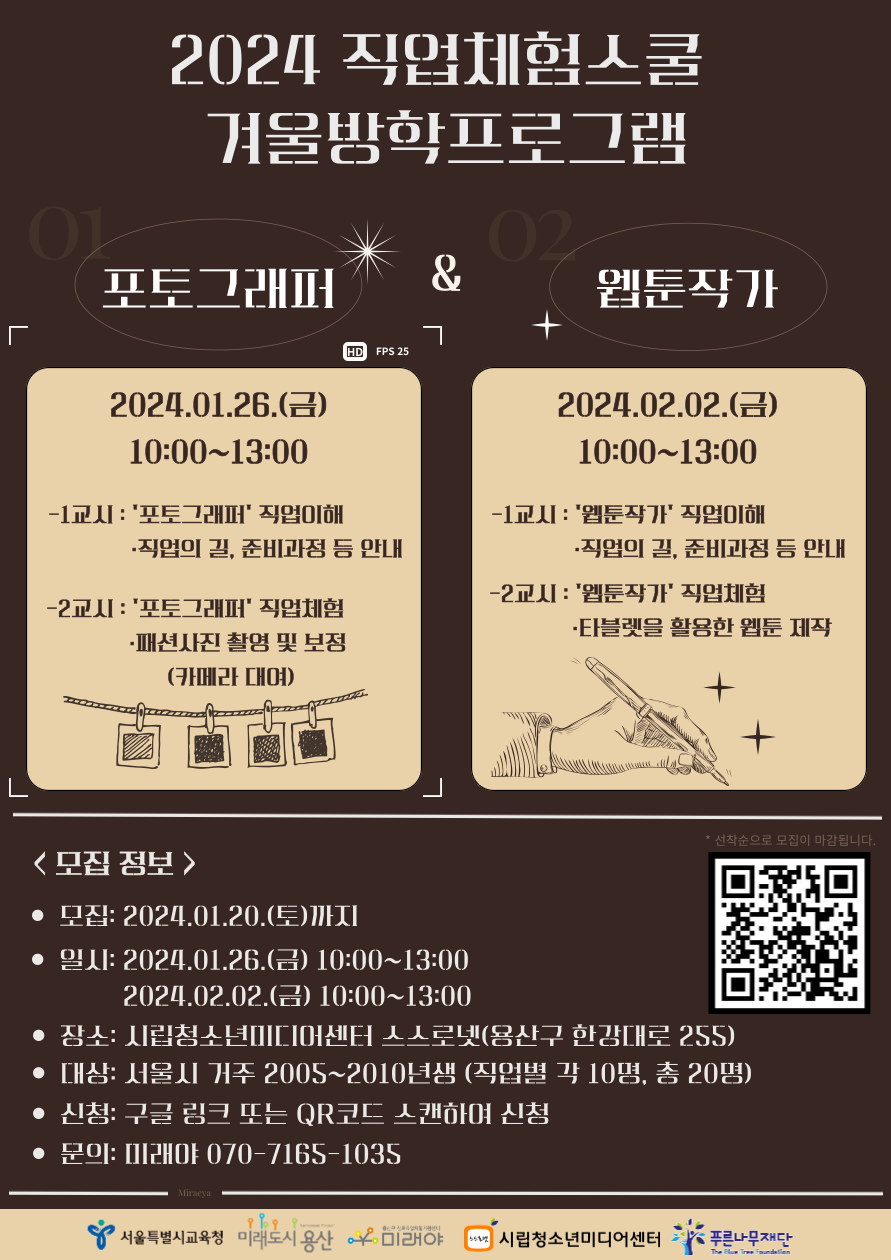 포토그래퍼와 웹툰작가 직업에 관심이 있는 청소년 대상으로 직업체험스쿨을 진행합니다.