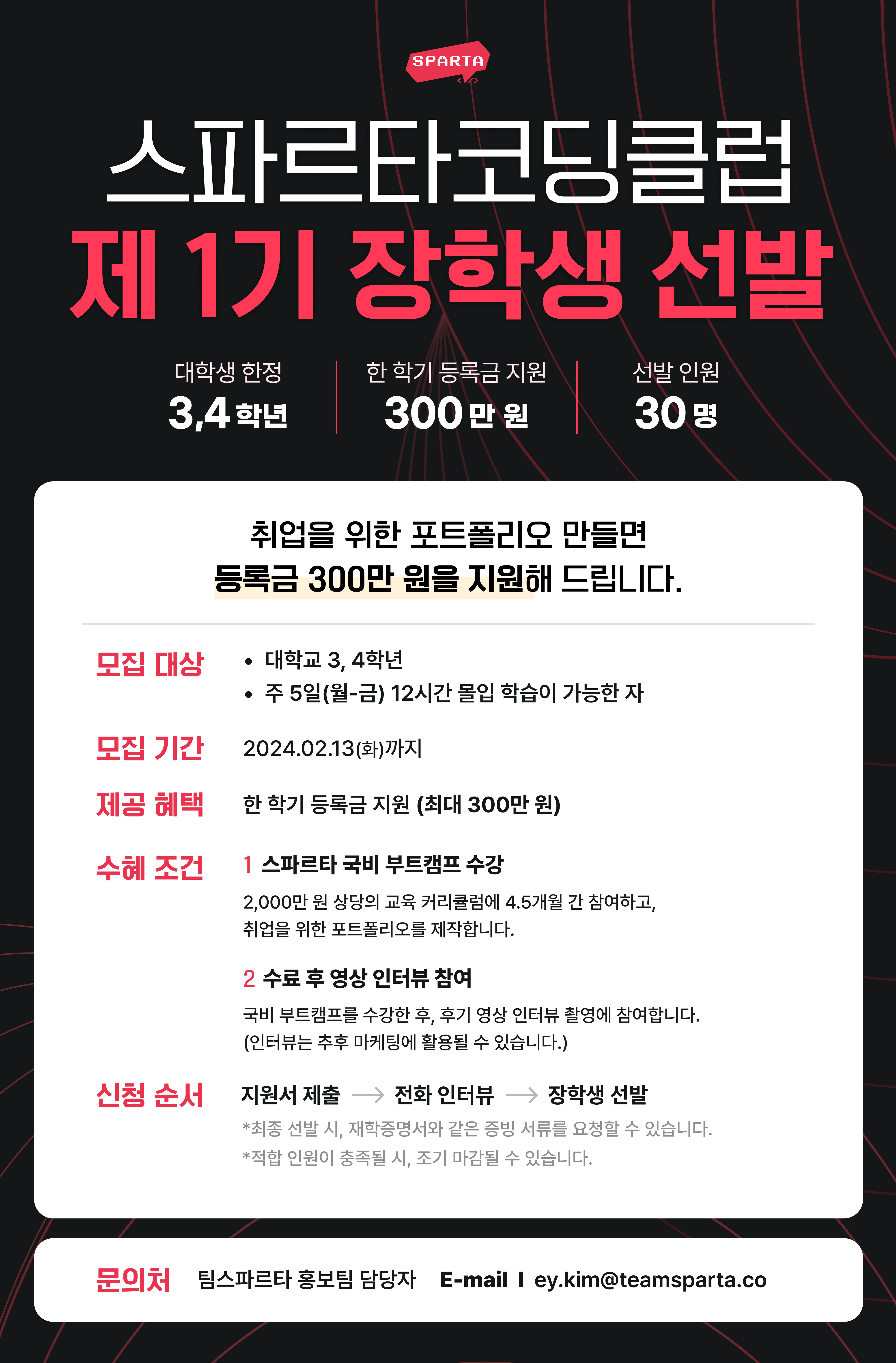 홈페이지(https://bit.ly/sparta-scholarship) 내 '장학생 지원하기>' 버튼 클릭 후 지원서 제출