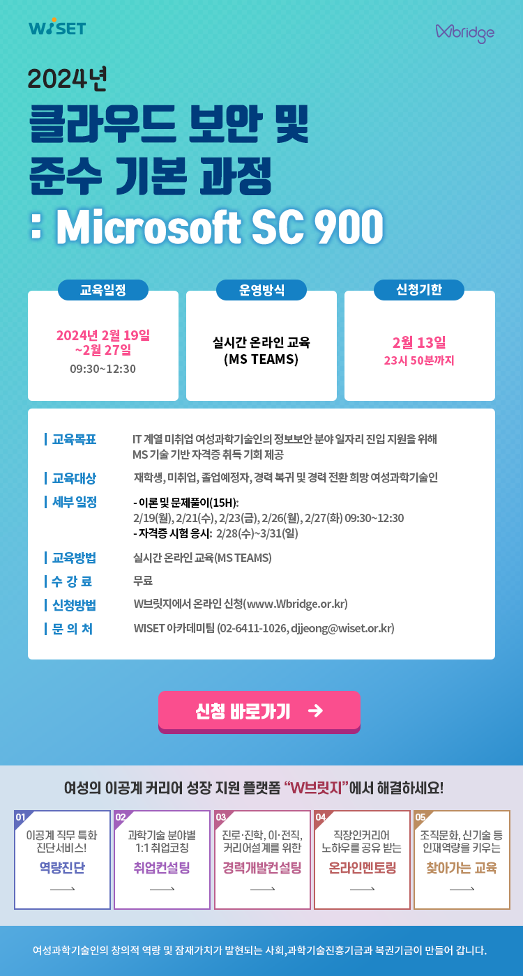 IT 계열 미취업 여성과학기술인의 정보보안 분야 일자리 진입 지원을 위해 MS 기술 기반 자격증 취득 기회를 제공함