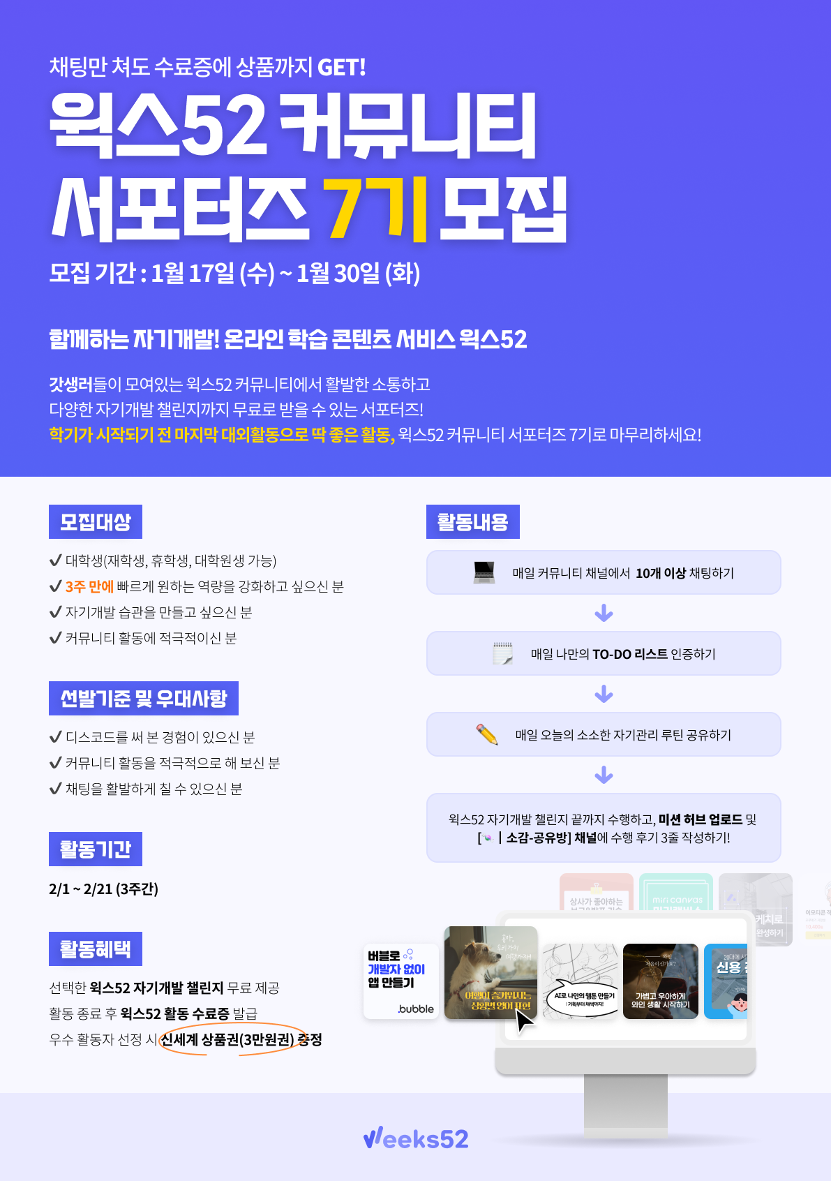 • 서포터즈 관련 모든 활동 및 소통은 윅스52 디스코드 커뮤니티에서 진행됩니다.