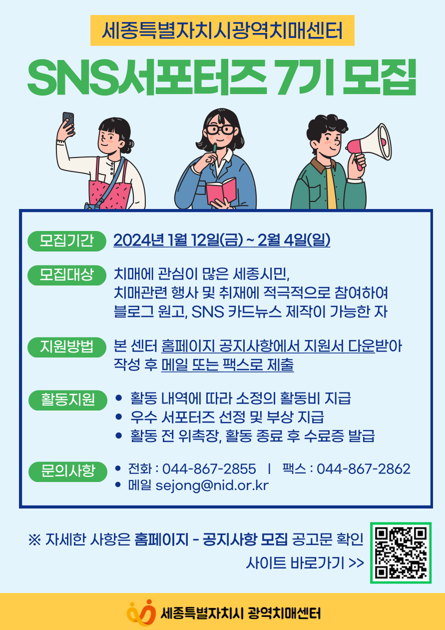 - 기타 혜택:「세종광역치매센터 SNS서포터즈 활동 규정」의거 * 추후 자세한 활동 안내 예정