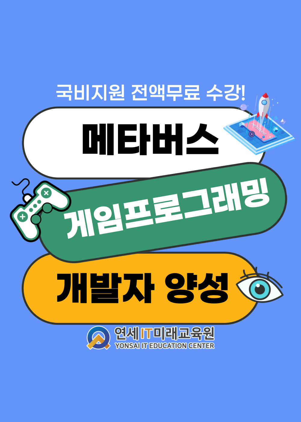 #게임프로그래밍 #게임개발 #프로그래밍 #개발자 #유니티 #C# #모바일게임 #pc게임 #게임프로그래밍국비지원 #게임개발국비지원 #국비지원컴퓨터학원 #수원컴퓨터학원 #IT국비지원 #내일배움카드 #게임포트폴리오 #연세IT미래교육원 #국비교육 #개발자취업 #취업준비 #코딩부트캠프 #국비지원코딩 #게임코딩
