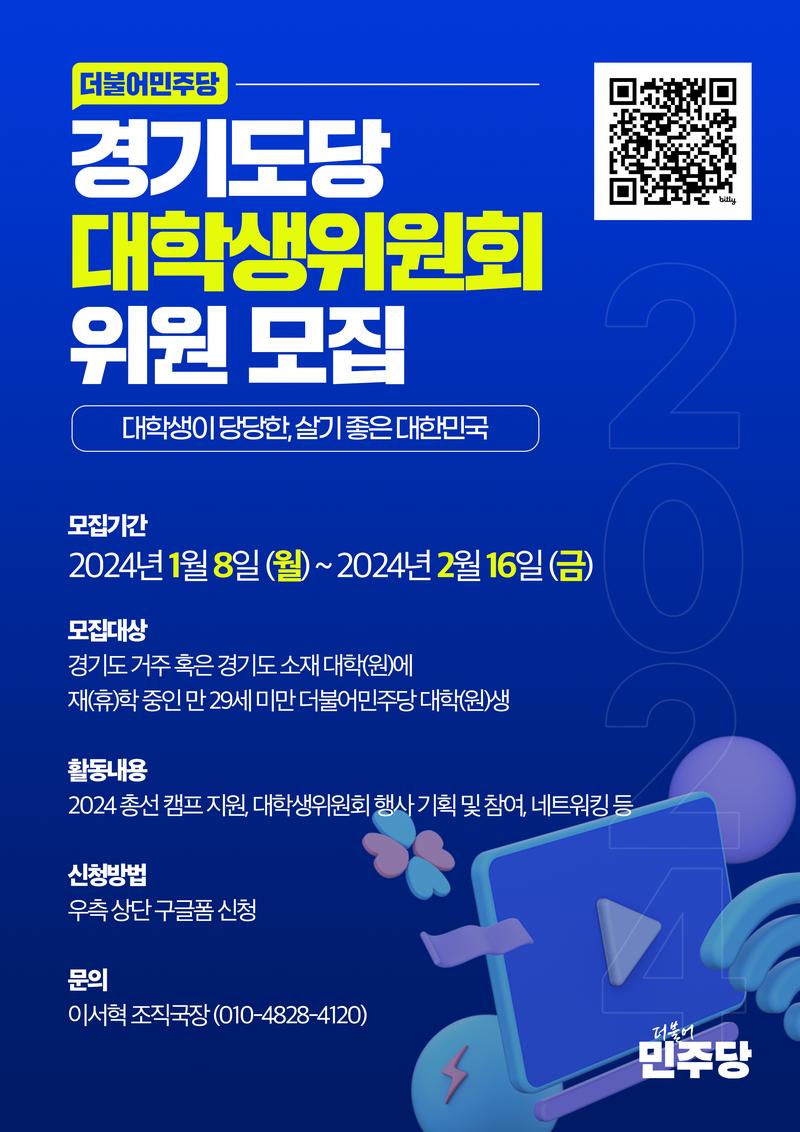 * 모집 대상: 경기도 거주 혹은 경기도 소재 대학(원)에 재(휴)학 중인 만29세 미만 더불어민주당 대학(원)생