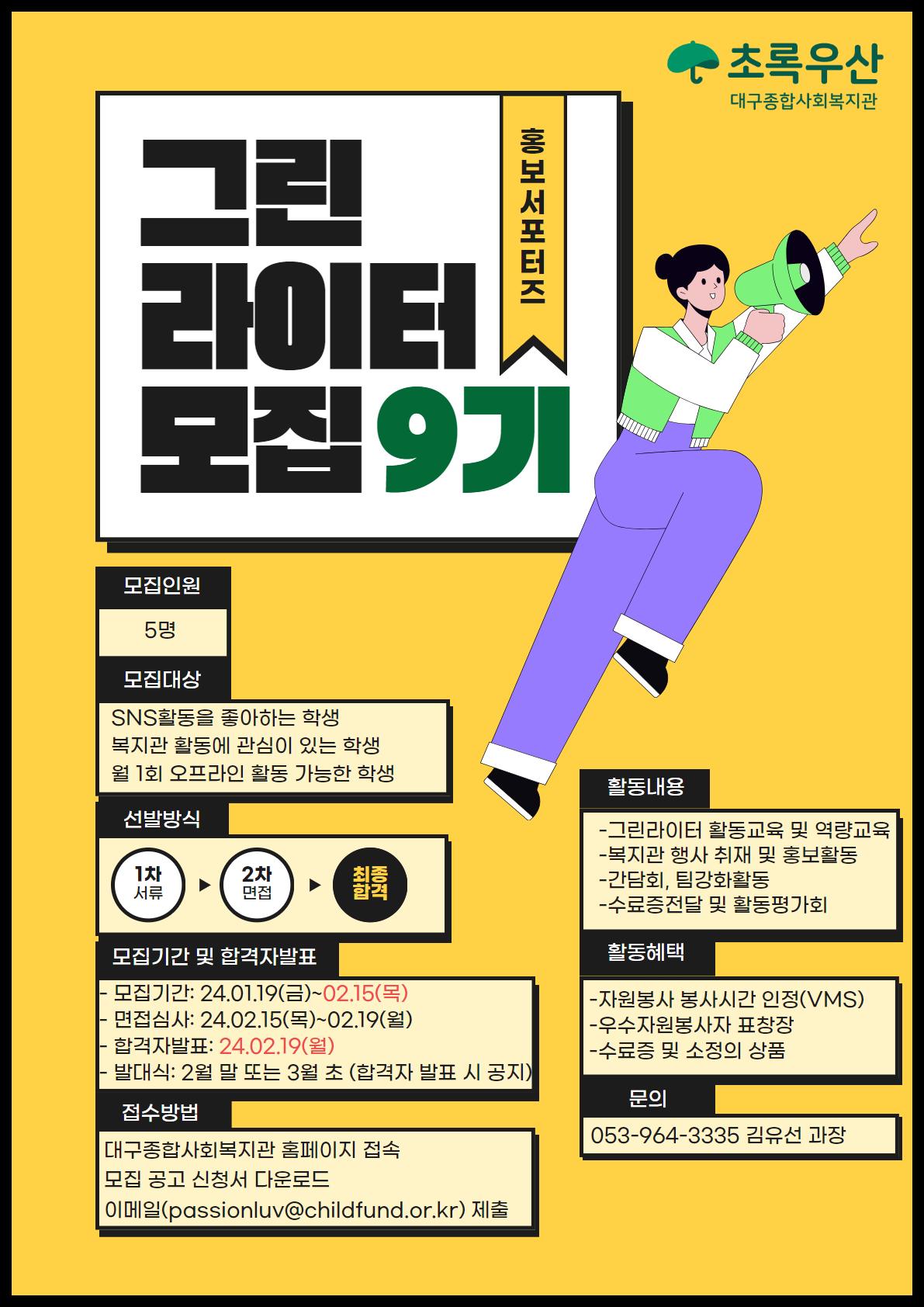 “2024 대구종합사회복지관 그린라이터 9기 모집” 게시글에서 지원서 다운로드 후 작성하여 이메일 제출