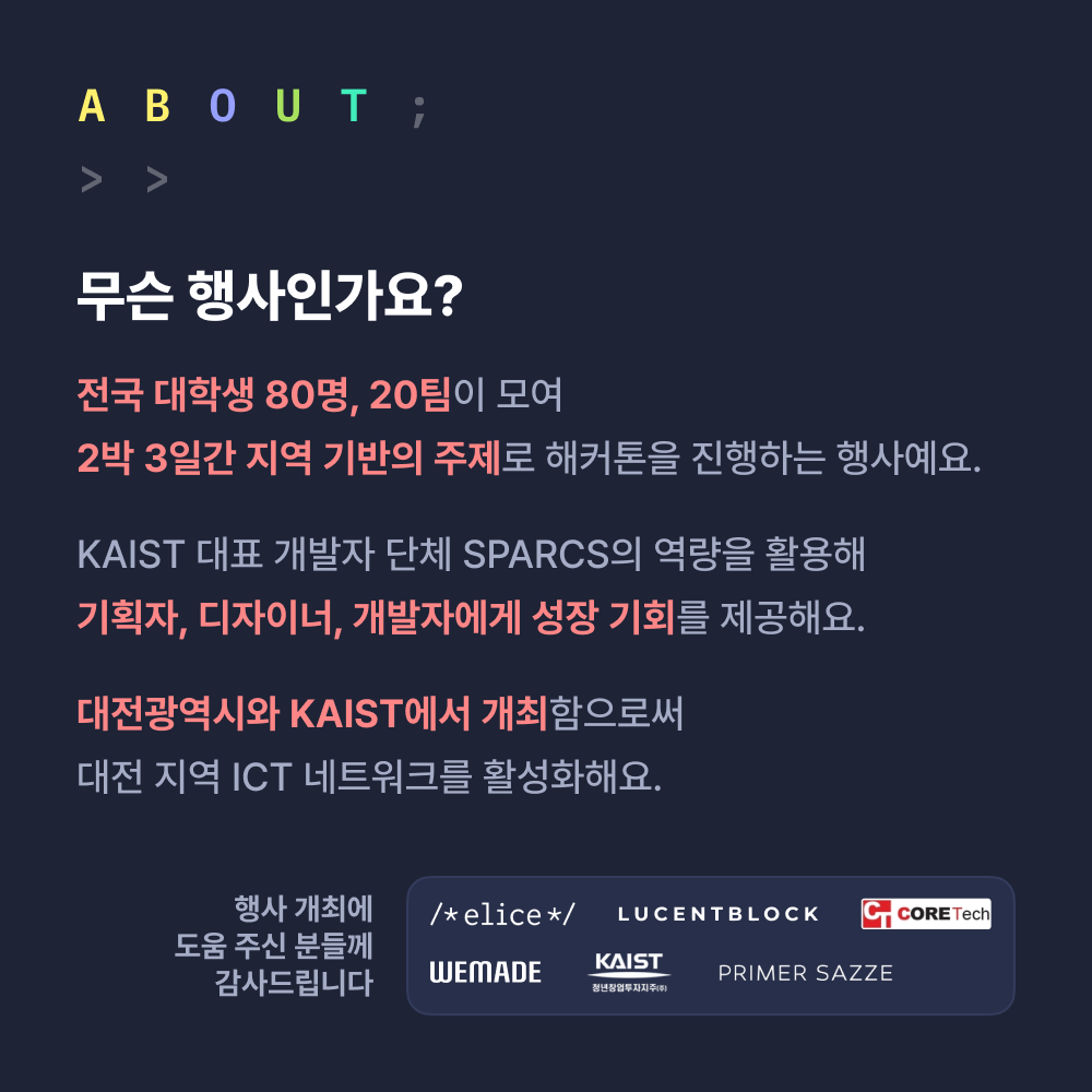 - 대상: 기획, 개발, 디자인 등 해커톤에서 팀으로 활동할 수 있는 전국 대학생 80명 누구나