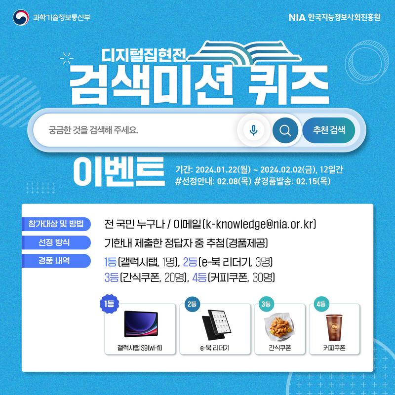 디지털집현전 서비스 개시와 함께 대국민 대상으로 검색미션 퀴즈 이벤트가 진행됩니다.