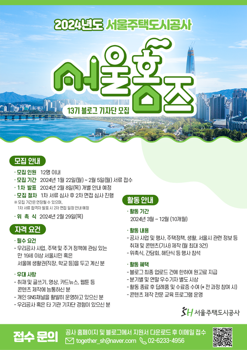 - 접수 방법 : 공사 홈페이지 및 블로그에서 지원서 다운로드 후 이메일(together_sh@naver.com)로 접수