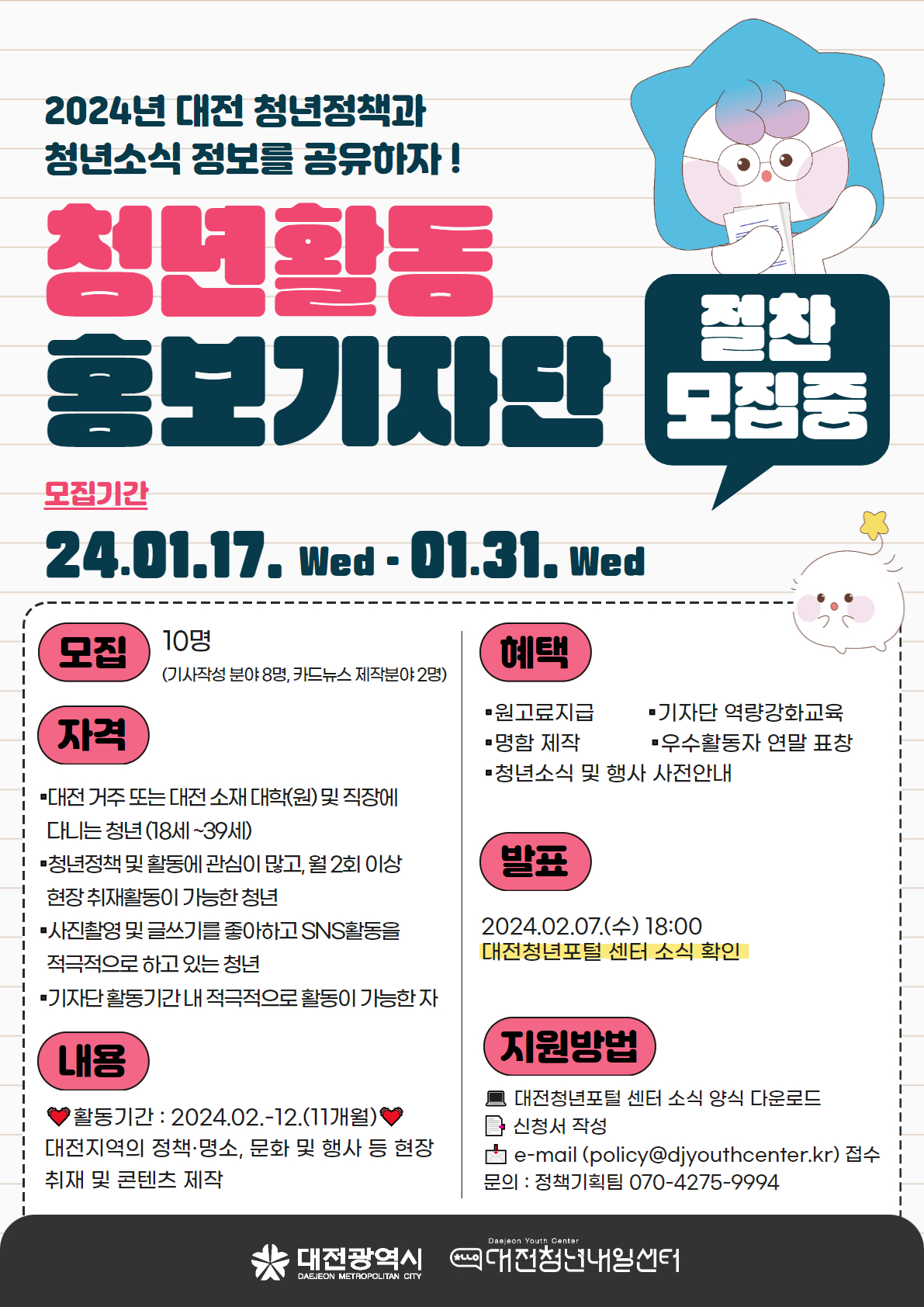 2024년 대전청년정책과 청년소식 정보를 홍보할 청년활동홍보기자단을 모집합니다!