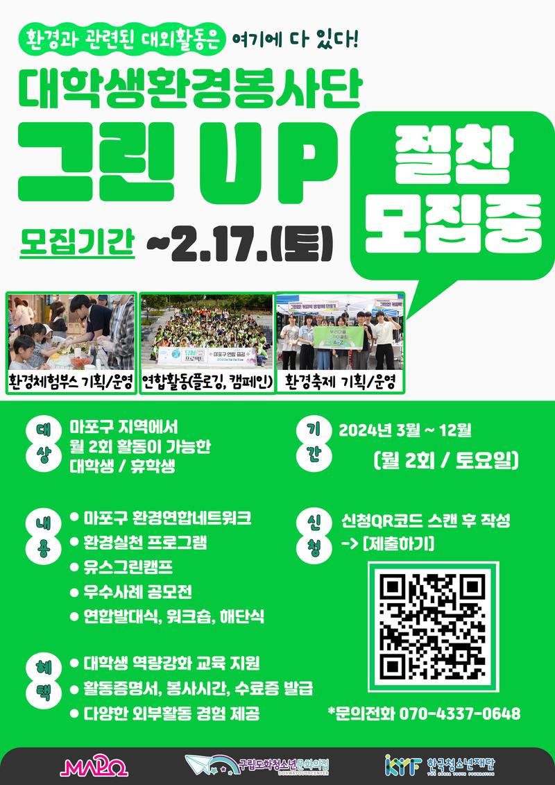 [구립도화청소년문화의집 ‘대학생환경서포터즈 그린업’ 모집]