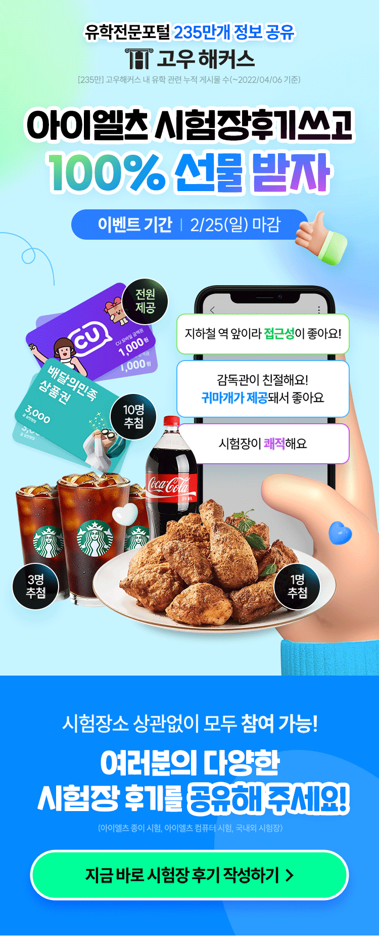 아이엘츠 시험을 쳤다면 누구나! 시험장 후기 쓰면 기프티콘 100% 쏜다!