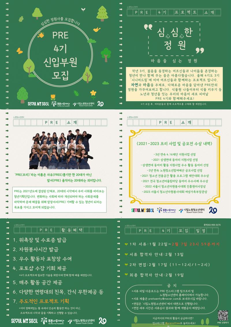 문의사항은 인스타그램 @prenotfree 또는 pretwenty@naver.com, 노원청소년센터 청소년사업팀 02-950-3175로 부탁드립니다.