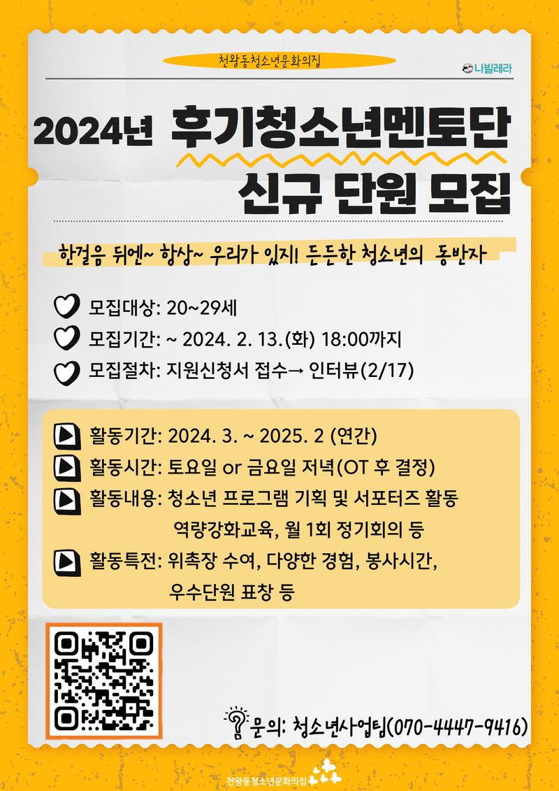 2024년 천왕동청소년문화의집 후기청소년멘토단 모집