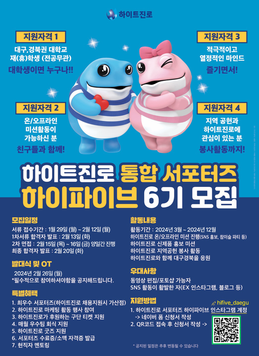 - 2024년 하이트진로 대구경북 통합 서포터즈 "하이파이브" 6기 모집합니다.