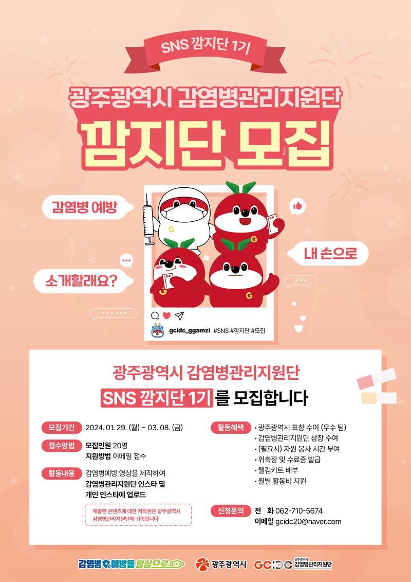 함께하는 감염병 예방 “모여라 깜지단”은 SNS 활동으로 광주광역시 내 유행하는 감염병의 예방 및 관리방법을 1분 이내의 영상을 제작하여 인스타에 업로드하는 소셜 미디어 홍보단 입니다.