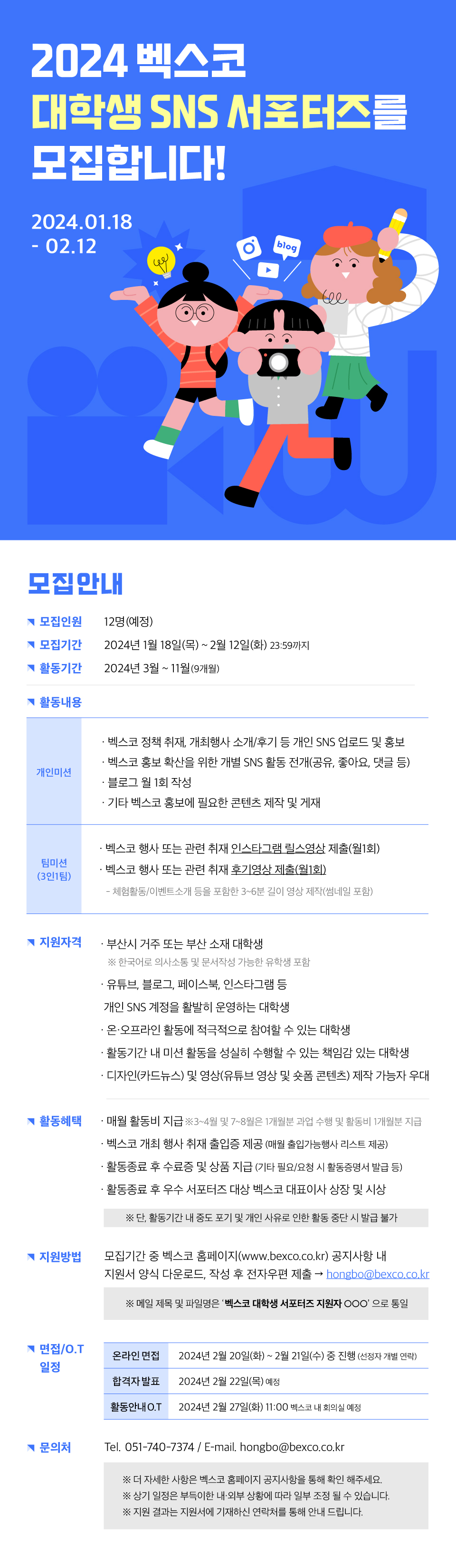 트렌디한 감각과 열정으로 벡스코의 생생한 이야기를 전할 벡스코 서포터즈를 모집합니다.