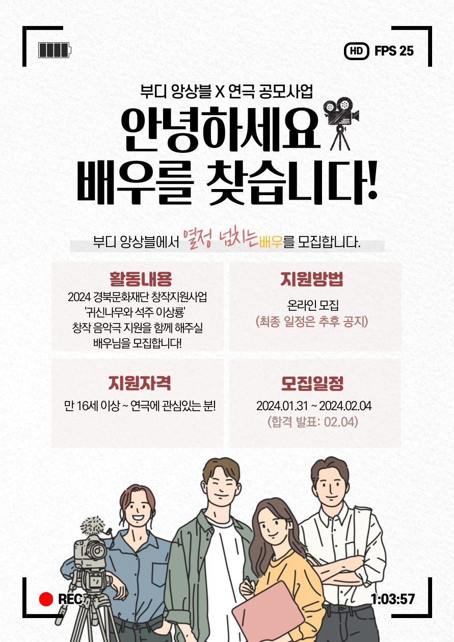 부디 앙상블과 함께 2024년 경북 문화 재단 창작 지원 사업, 음악 극 “귀신 나무와 이상룡”에 지원하여 2년(혹은 그 이상)동안 함께 무대에 서주실 열정 가득한 배우님을 모집합니다.