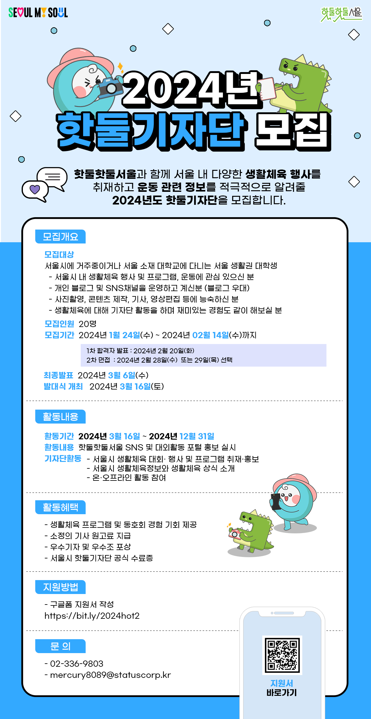 핫둘핫둘서울과 함께 서울 내 다양한 생활체육 행사를 취재하고 운동 관련 정보를 적극적으로 알려줄 2024년도 핫둘기자단을 모집합니다.